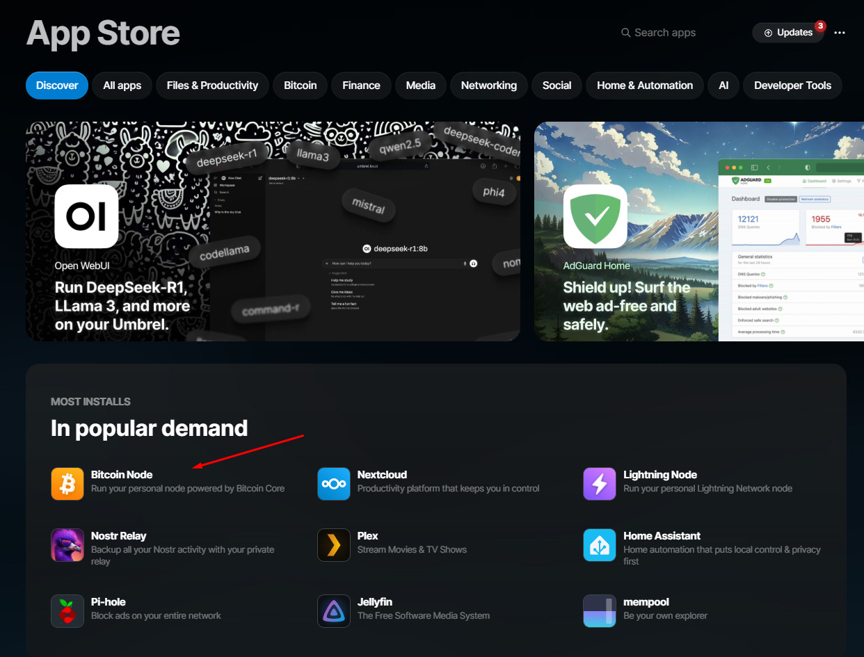 Com o Umbrel pronto, instale o Bitcoin Core através da store: