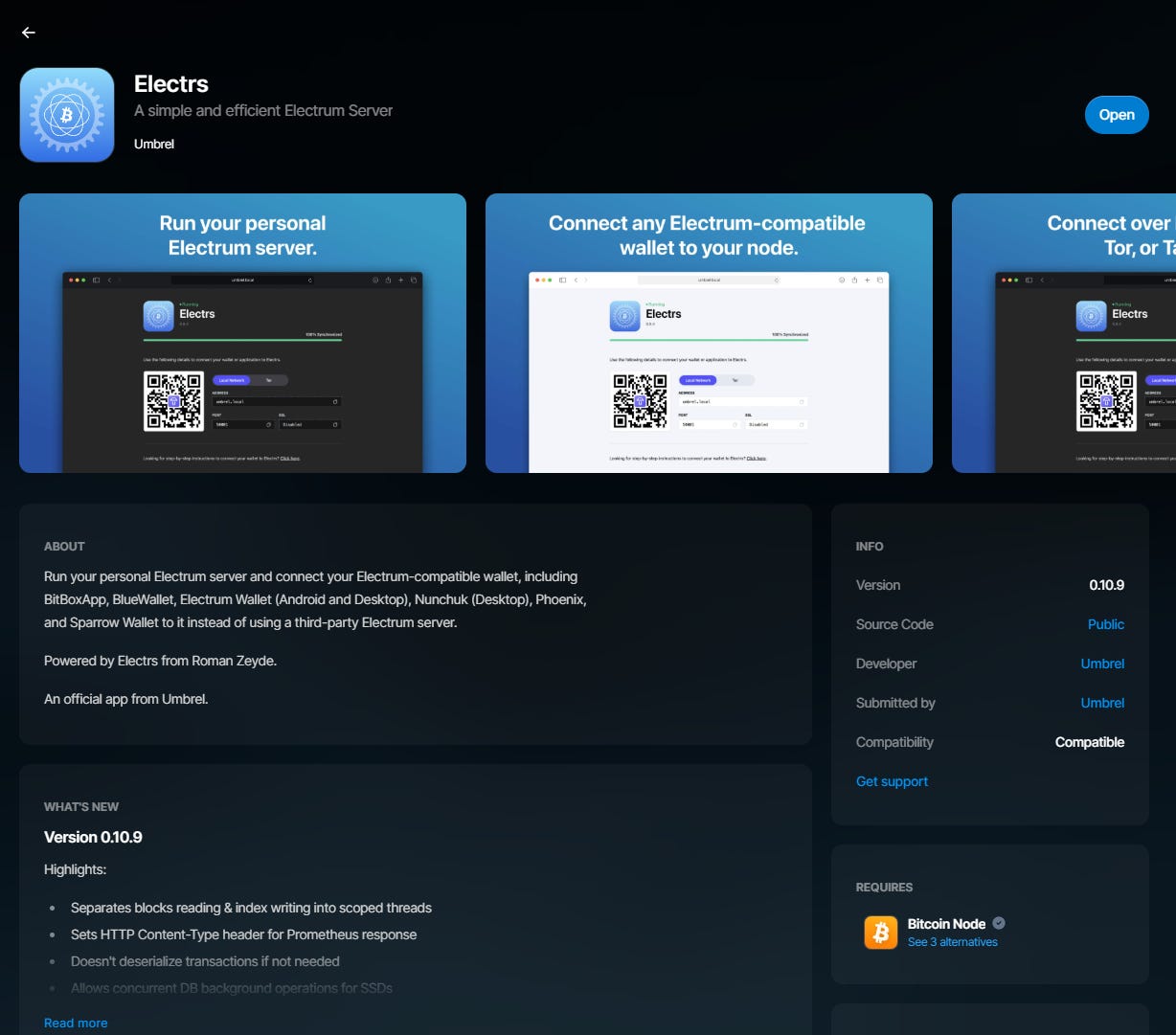 Agora é hora de se conectar ao seu novo full node e apreciar um mundo de privacidade. A maioria dos programas mais comuns para gerenciamento de carteiras permite essa conexão direta a um node privado, até os de celular. Para cada um deles você vai achar tutoriais no youtube de como realizar essa configuração. Eu recomendo que você instale também o Electrum Server, pois várias wallets conectam através da interface do Electrum ao invés de utilizarem o Bitcoin Core. Procure por “electrs“ na store: