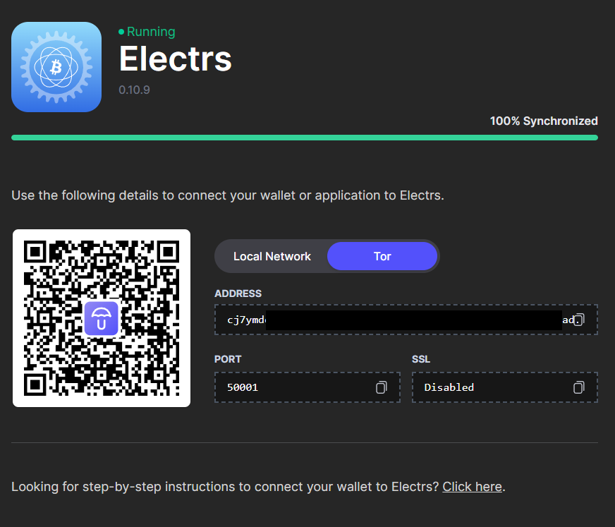 Ao abrir o app do Electrs, você verá uma barra de progresso que é o status atual do seu electrum server. Ele também precisa fazer uma configuração inicial para indexar todas as informações que ele lê do seu Bitcoin Core. Basta sentar e esperar. Depois de pronto você terá as credenciais de acesso tanto via rede local quanto via TOR: